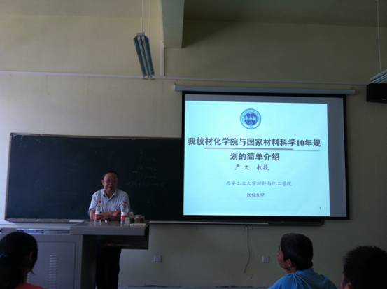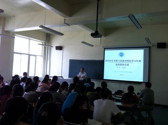 严文教授以“我校材化学院和国家材料科学10年规划”为题,为同学们简要地介绍了我院的历史与现状和材料科学与工程的相关知识。内容包括:永利yl23411集团的发展史;永利yl23411集团硕士研究生等学位授予问题;21世纪材料科学与工程前景以及材料在人类发展史中的作用等。期间,严老师睿智风趣的语言赢得了同学们的阵阵掌声。