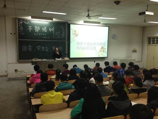 本次培训是材化学院2014年度学生干部系列培训的最后一讲,之前由院党委副书记张治宏、辅导员组长方由林和院团委书记王国栋分别从学生干部的素质、能力和职责几方面展开培训。学生干部系列培训全面培养学生干部素质与能力,促进了学生干部队伍建设,为推动学院整体工作打下了坚实基础。