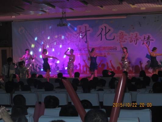 本次晚会共分为上下两个半场,晚会在一首劲爆歌曲中开幕,同学们马上进入了欢悦的状态,学院书记张忠老师上台为此次晚会致开幕词,她代表材化学院全体师生对2015级新生表示热烈的欢迎,对新生报以热切的希望,她要求大家在四年的学习中以学校目标教育为指导顺利完成大学学习及生活。接下来每个节目更是震古烁今,现场欢呼声不断。中场环节中,老师及学生同台做游戏,并抽取了八名幸运微博好友。晚会节目样样精湛绝伦,恰恰,街舞,情景剧……至此,本届迎新晚会在同学们的尖叫声中落下帷幕。