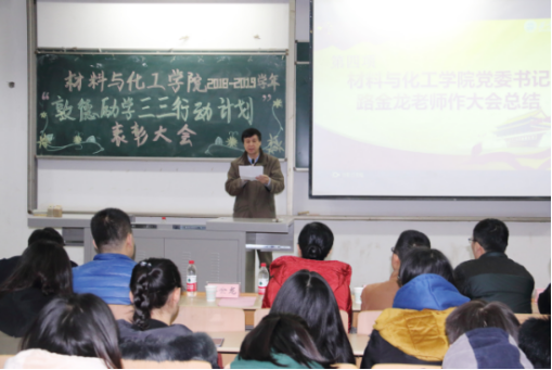2018年12月12日,永利23411集团2018年“敦德励学三三行动计划”总结表彰大会在教1-105隆重举办。材化学院党委书记路金龙出席此次大会并发表讲话,学院党委副书记张艳霞、学生班主任、全体辅导员、获奖学生和学生代表参加了此次大会。