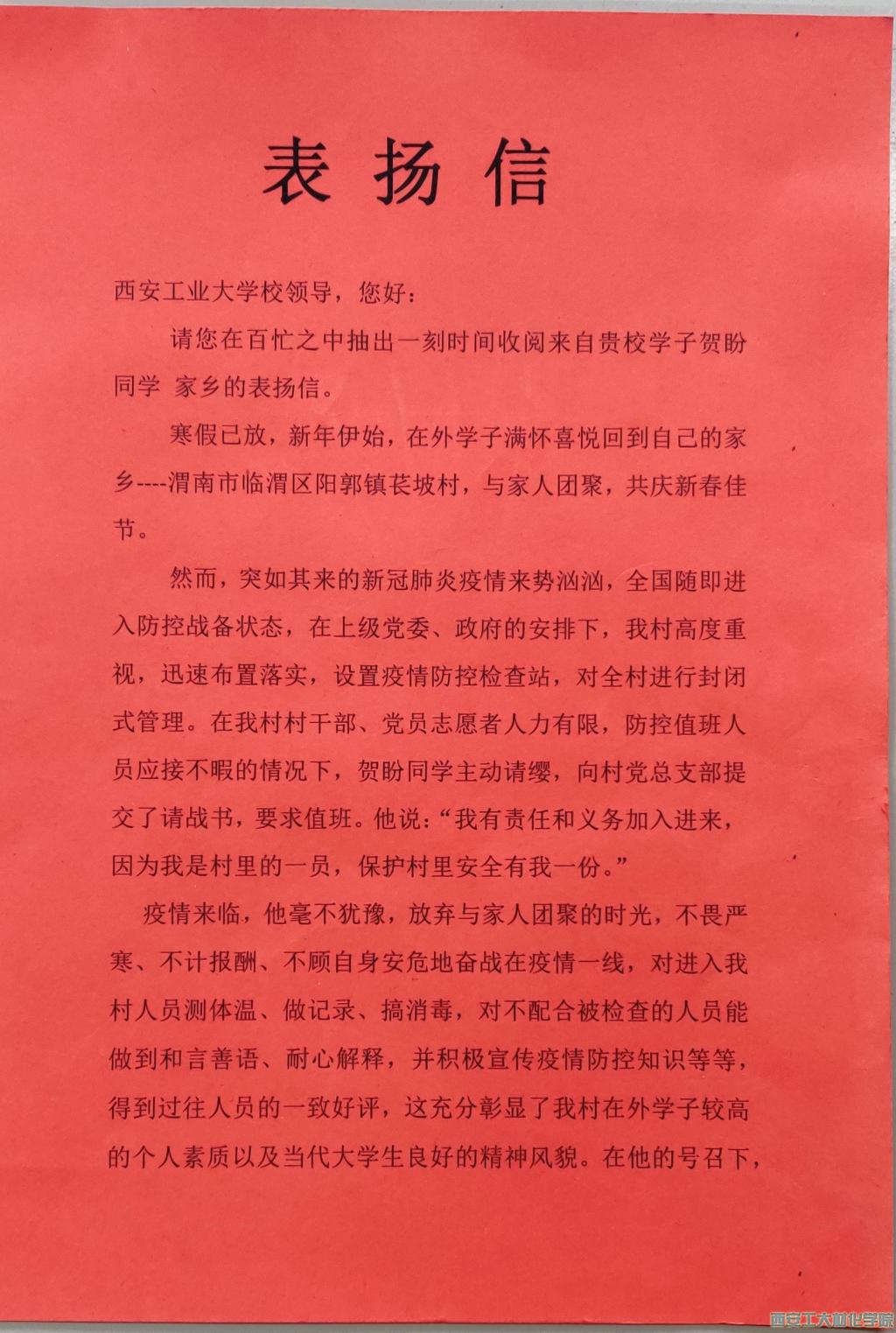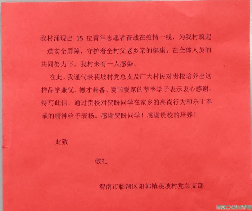 近日我院收到了来自渭南市临渭区阳郭镇医坡村的疫情表扬信,信中对材化学院2018级材料化学专业贺盼同学在疫情期间,为当地疫情防控工作贡献青春力量提出了感谢和表扬,并对永利yl23411集团立德树人、人才培养和育人工作给予高度的肯定。
