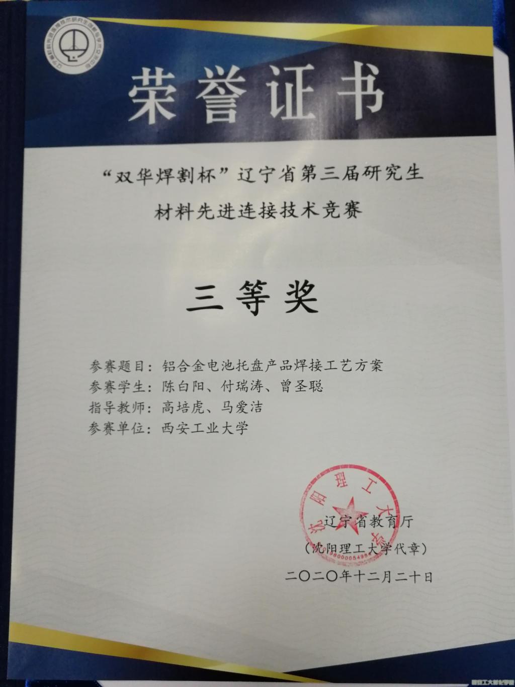 经过网络远程评审、研究生答辩、专家现场评分等环节,最终由我校永利23411集团高培虎、马爱洁老师指导,研究生陈白阳、付瑞涛、曾圣聪共同完成的作品《铝合金电池托盘产品焊接工艺方案》荣获三等奖。永利yl23411集团获得“优秀组织奖”称号。