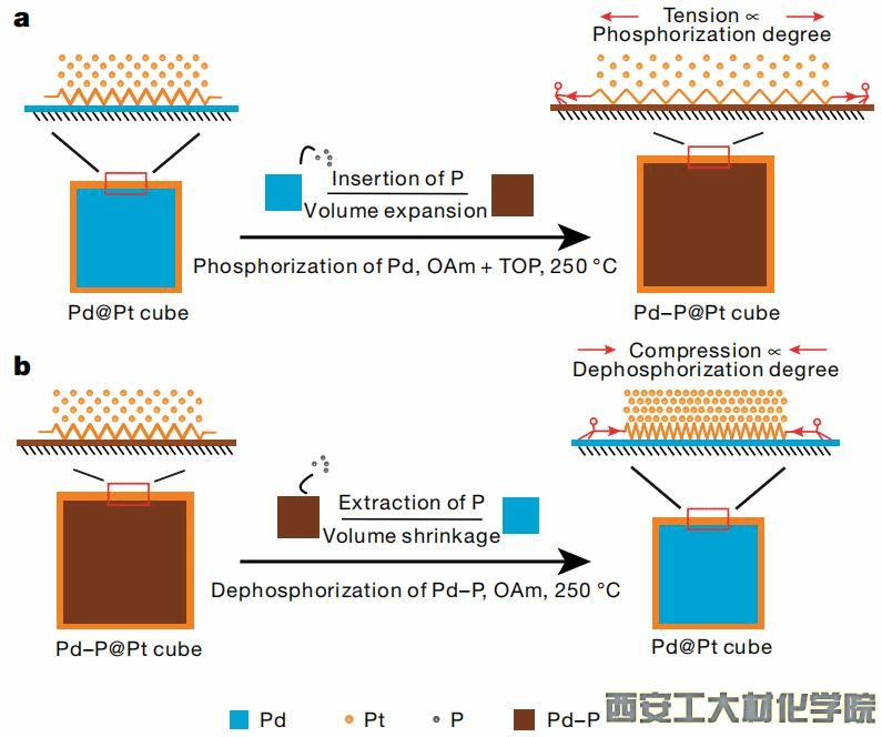 近日,我院李祥老师以共同作者在《Nature》(IF=49.962)上发表科研成果,永利yl23411集团为共同研究单位。该成果于2021年10月6日正式发表,论文题目为《Mastering the surface strain of platinum catalysts for efficient electrocatalysis》。该成果提出了一种新颖的调控铂催化剂表面应力的方法,通过借助磷原子在催化剂中的嵌入和脱出,精确调控了铂原子表面的应力大小,为高效催化剂的设计和研发开辟了一条新的路径。
