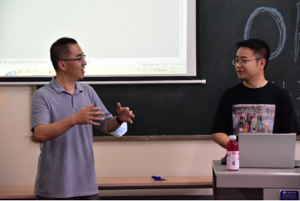 1 强涛老师(左)向参会同学介绍主讲嘉宾王亮亮同学(右)