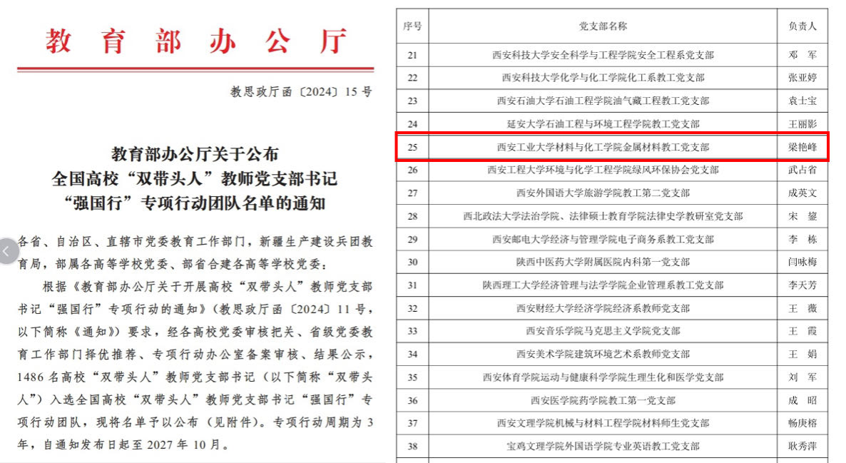 近日,教育部办公厅公布全国高校“双带头人”教师党支部书记“强国行”专项行动团队名单,我金属材料教工党支部成功入选。