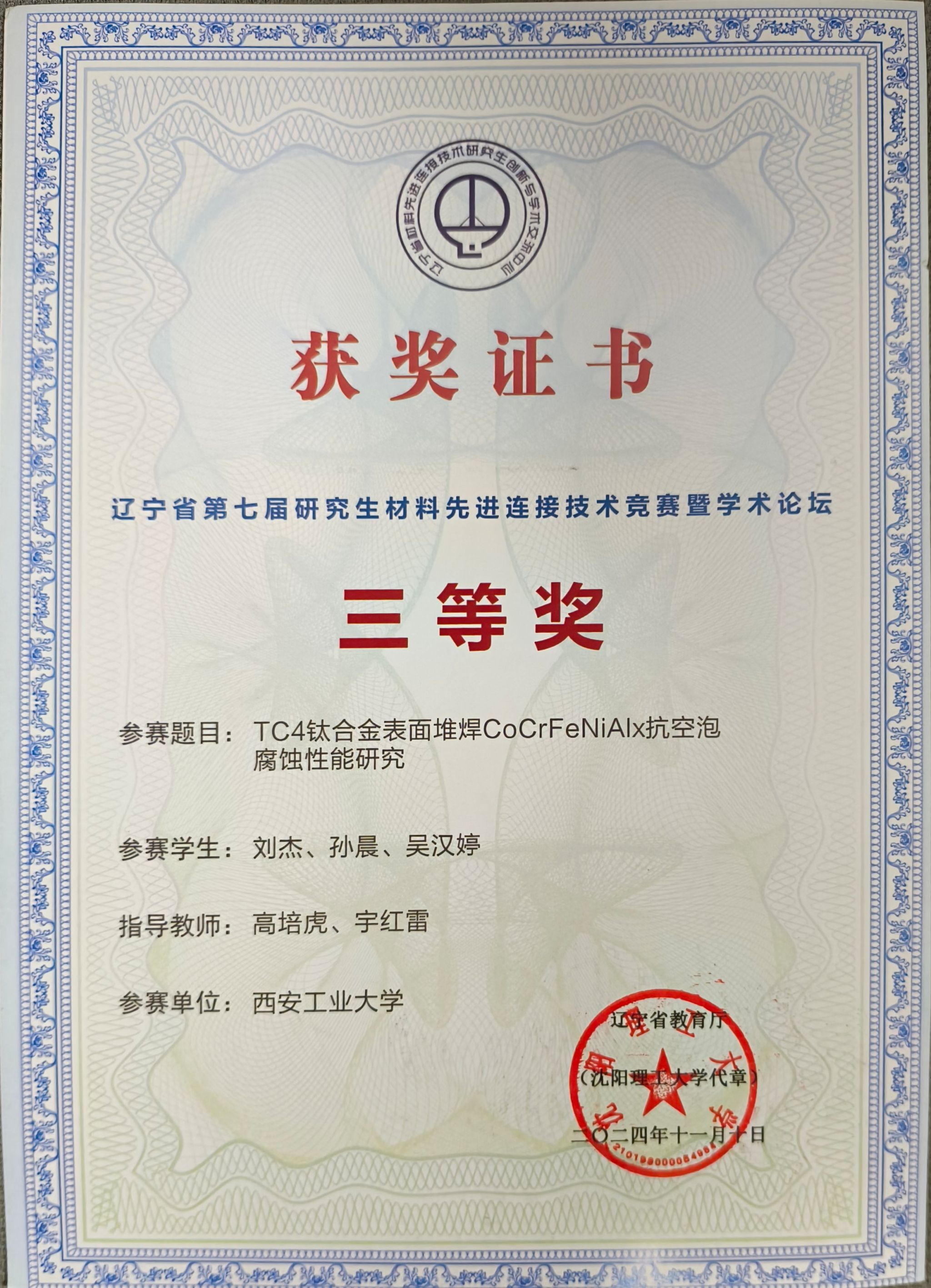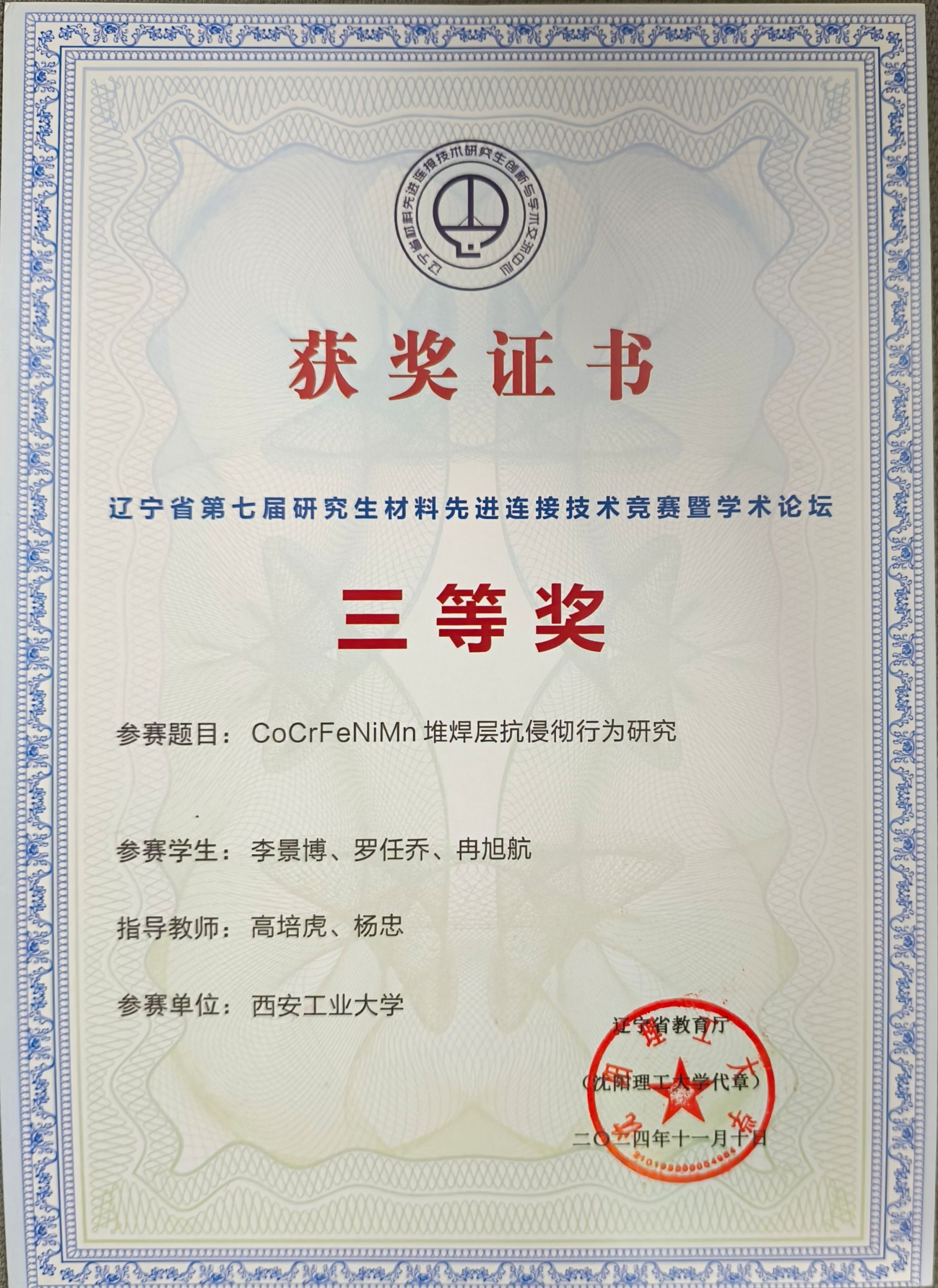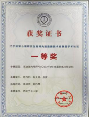 在研究生院的指导和大力支持下,永利23411集团高度重视、积极组织参赛。经过评审、研究生答辩、专家现场评分等环节,获得一等奖1项、三等奖2项,永利yl23411集团获优秀组织奖。其中由高培虎、郭巧琴指导,研究生陈白阳、赵大明、张波共同完成的作品《高速激光堆焊AlxCoCrFeNi高温抗氧化性研究》荣获一等奖,高培虎、杨忠指导,研究生李景博、罗任乔、冉旭航共同完成的作品《CoCrFeNiMn堆焊层抗侵彻行为研究》荣获三等奖,高培虎、宇红雷指导,研究生刘杰、孙晨、吴汉婷共同完成的作品《TC4钛合金表面堆焊CoCrFeNiAlx抗空泡腐蚀性能研究》荣获三等奖。