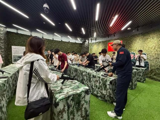 互动体验环节,同学们迎来了沉浸式实践挑战。专业教官指导下的拆枪训练中,大家分组协作拆解经典枪械,细致观察零件间的精密咬合,感受兵器制造对材料性能、加工精度的严苛要求。“原来枪管的耐磨性与材料的晶粒度息息相关!”一名材化学院学生在实践中兴奋地分享专业发现。随后的情景模拟打枪练习,逼真的战场音效与虚拟对抗场景,让同学们身临其境地体会到军人保家卫国的责任担当。