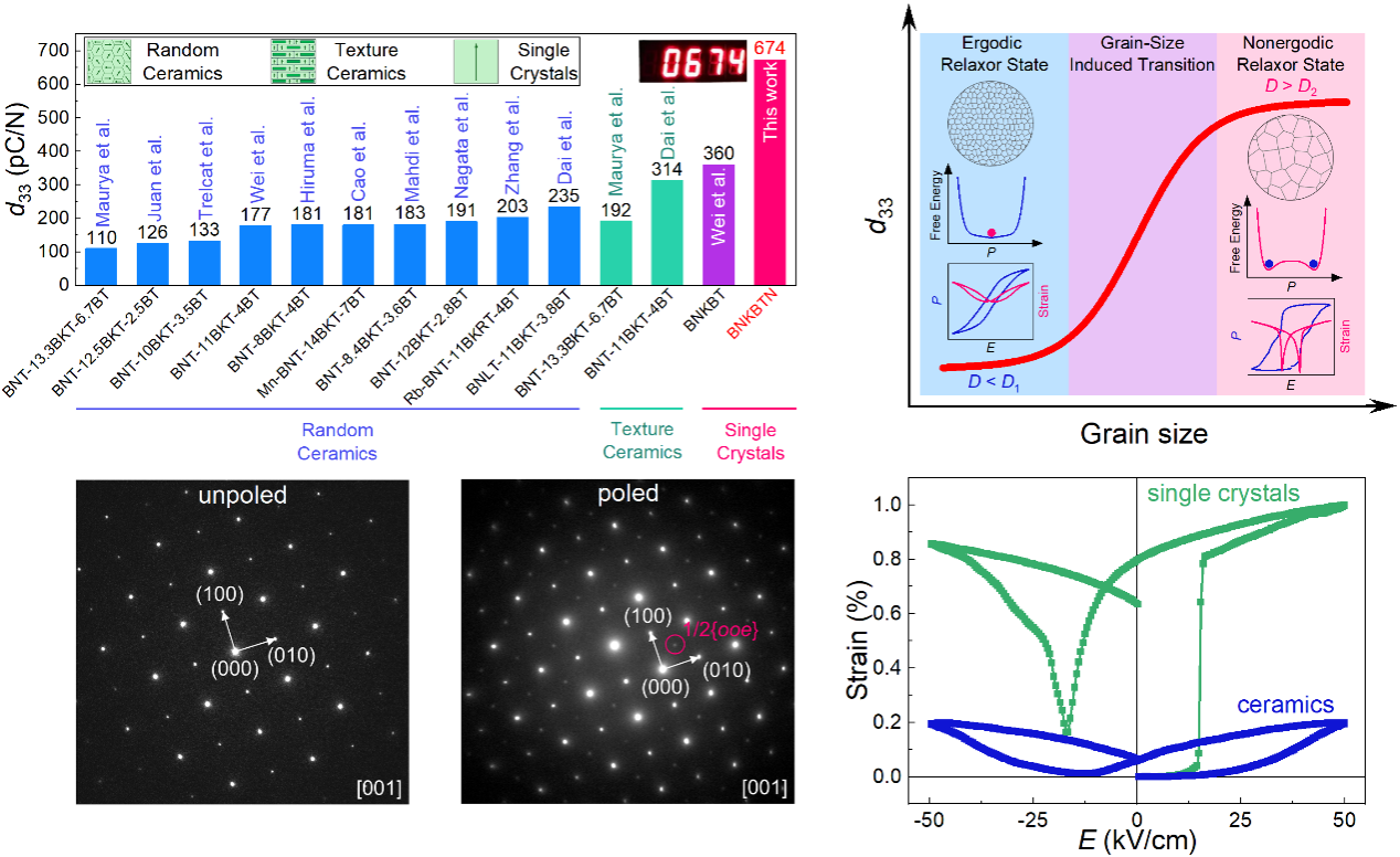 近日,我校魏永星副教授研究团队硕士研究生关畅澎在国际顶级学术期刊《Acta Materialia》(IF=9.3)上发表了题为“High piezoelectric performance and ergodic-nonergodic relaxor transition induced by single crystallization in Bi0.5Na0.5TiO3-based materials”的学术论文。永利yl23411集团为第一通讯单位,魏永星副教授为通讯作者,西安交通大学靳立教授为共同通讯作者。