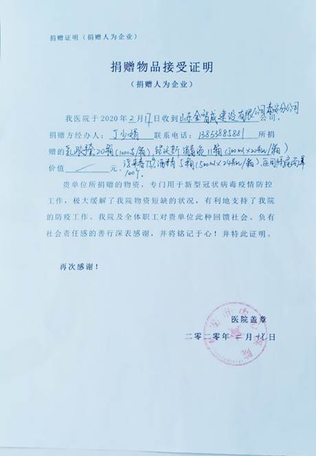 泰安市中心医院对贝胜男家人的善行和义举深表感谢并向贝胜男妈妈发放了捐赠证明。