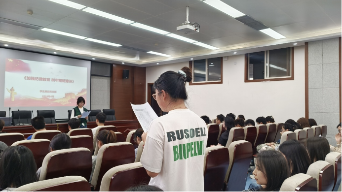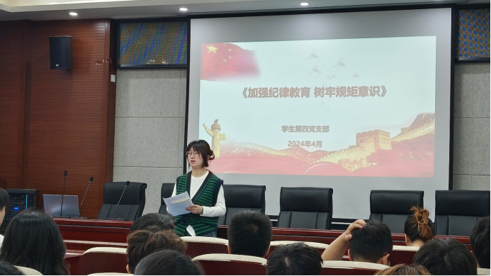 为学习贯彻习近平总书记关于党纪学习教育的重要讲话和重要指示精神,落实好学院党委开展党纪学习教育的要求,4月16日,永利23411集团学生第四党支部在工4-204开展“加强纪律教育,树牢规矩意识”主题党日活动。活动由党支部书记徐慧子主持,支部全体成员参加本次活动。