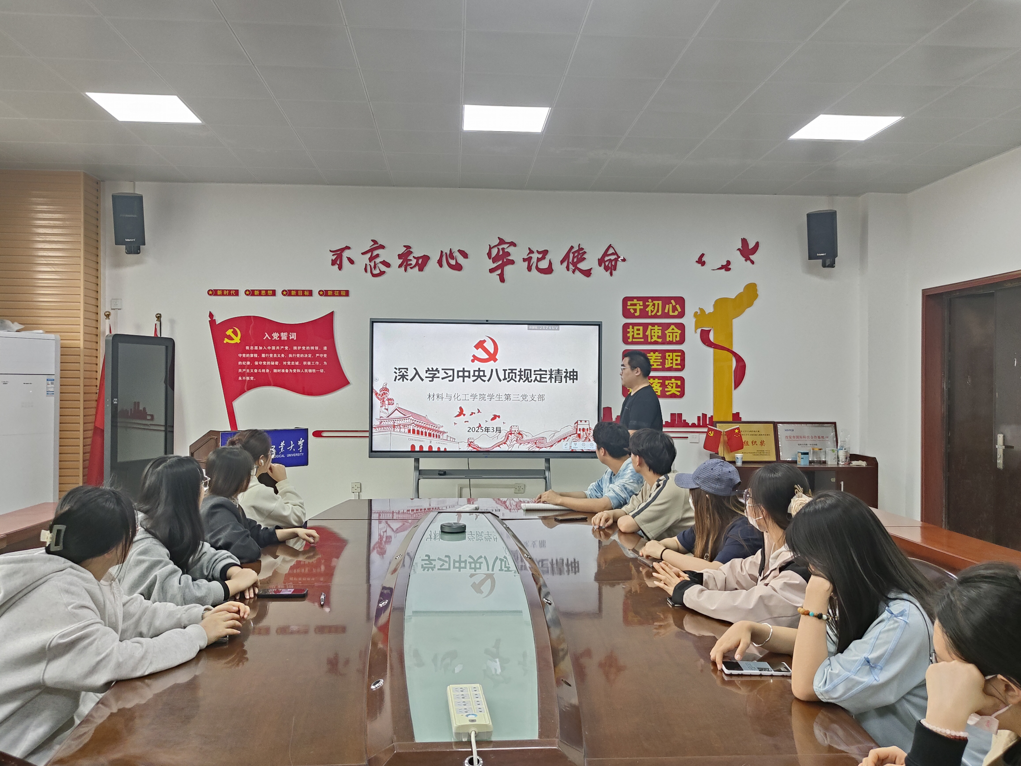 会议伊始,支部书记段强带领全体党员通过对原文的细致解读,让党员们深刻认识到中央八项规定不仅是“紧箍咒”,更是保护党员干部不犯错、少犯错的“护身符”。随后,大家一起学习了中央八项规定精神的厉行勤俭节约、反对奢侈浪费和奢靡之风、廉洁从政、工作作风务实等具体内容。在学习过程中,支部党员刘慧君、王雅婕、郝思宇等6名党员作为发言人分享学习感悟,与会人员积极交流。
