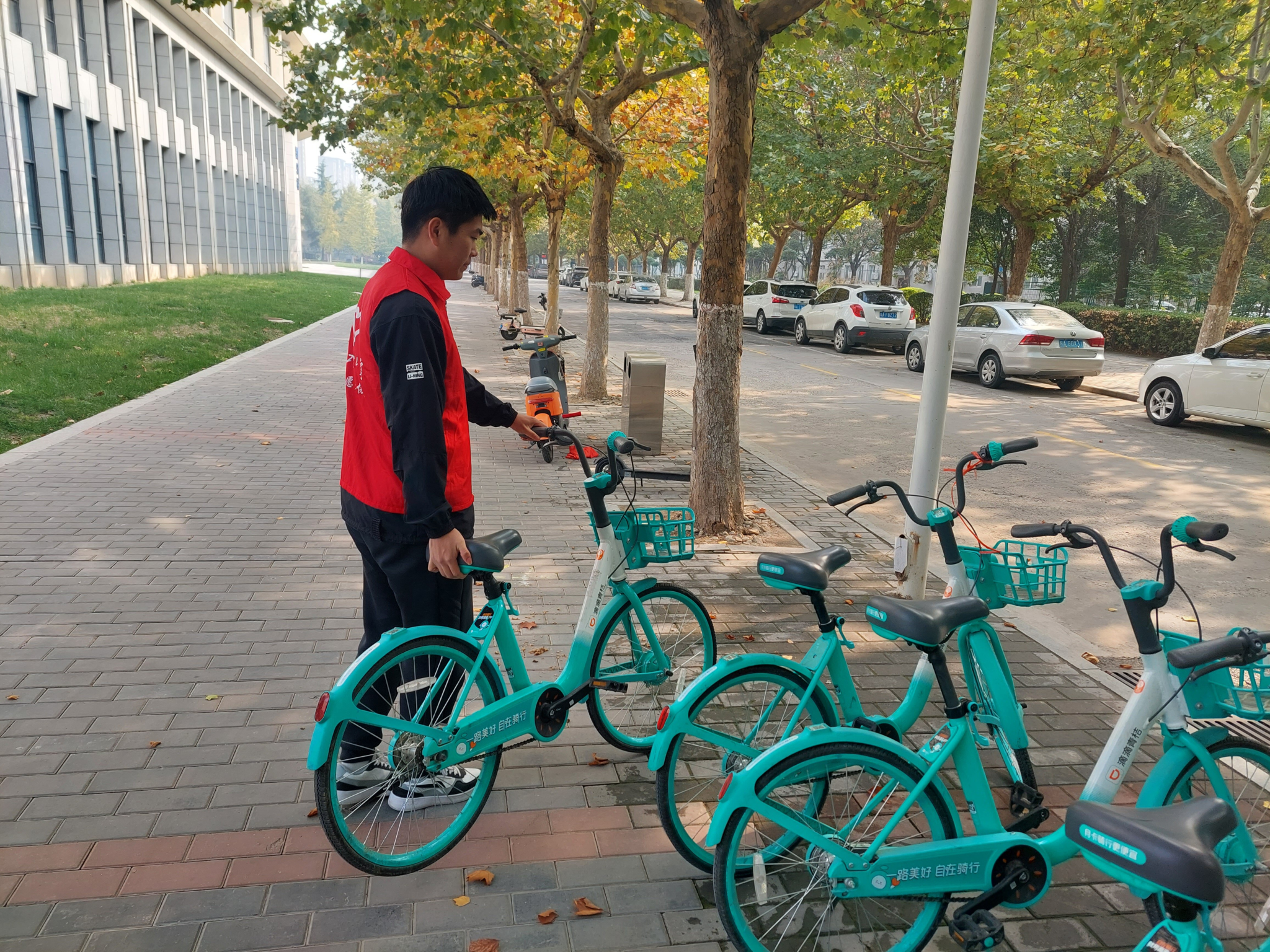 活动当天,志愿者们到达指定位置集合,身着统一志愿服装,精神饱满,斗志昂扬。在支部副书记秦正洋的统筹安排下,支部按照党小组分工,投入到紧张而有序的共享单车整理与摆放工作中。活动过程中,看到志愿者们摆放单车忙碌的身影,有的细心检查每辆单车的车况,确保刹车、车铃等关键部件完好无损;有的负责将整理好的单车整齐划一地摆放指定区域,为校园增添了一道亮丽的风景线,参与活动的党员不仅展现了高度的责任心和团队协作精神,还积极向过往的学生宣传绿色出行的重要性,倡导大家共同维护校园内的交通秩序和环保环境。