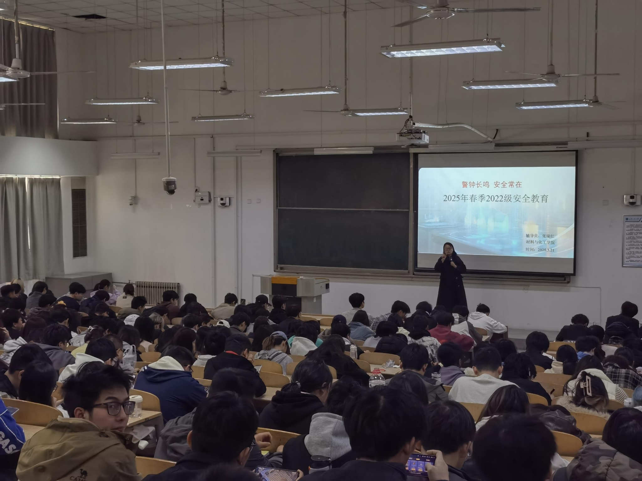 为了进一步加强校园安全教育,提高学生们的安全意识和自我保护能力,确保学生们身体健康生命安全,2025年3月21日中午,材化学院在教1-205召开2022级安全教育大会。会议由辅导员张瑞红主持,2022级全体学生参加大会。