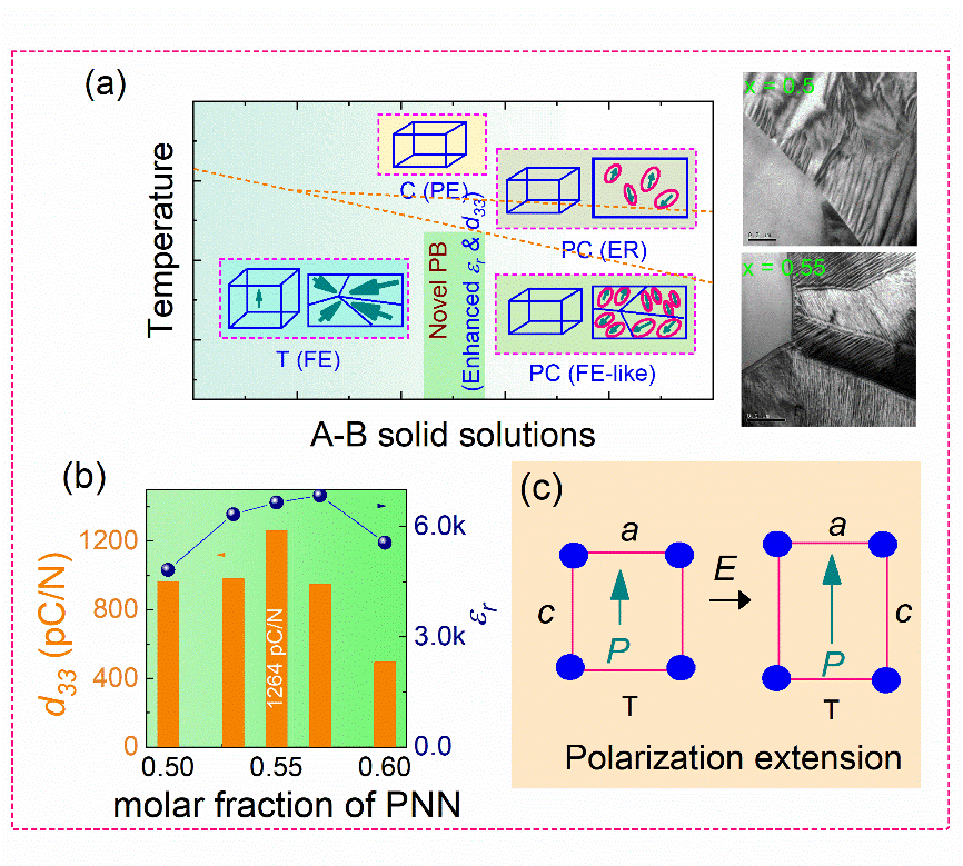 2. 发现了BiFeO3-BaTiO3 在三方—准立方相界附近电学性能的极大值效应,揭示了多种具备新型相界的高性能弛豫铁电体的极化行为演变规律。