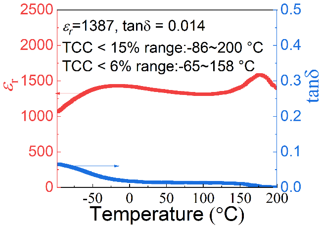 3. 成功研发了基于X8R(er, 3050;tand, 0.009)、X9R型(er,1300;tand, 0.014)MLCC器件的高介宽温域电介质陶瓷粉体制备技术,相关成果可应用于新能源汽车、航空电子、石油钻井等领域。