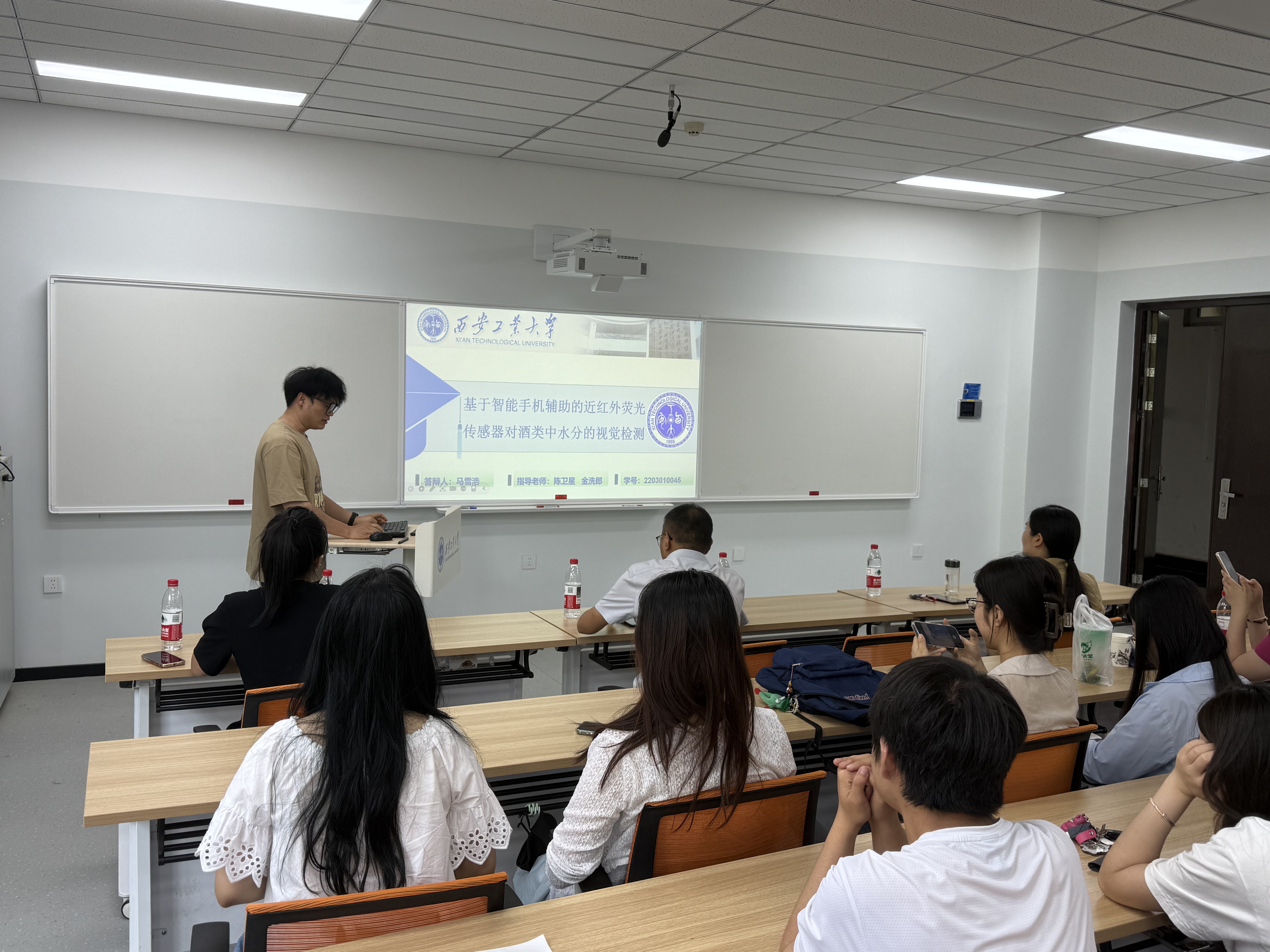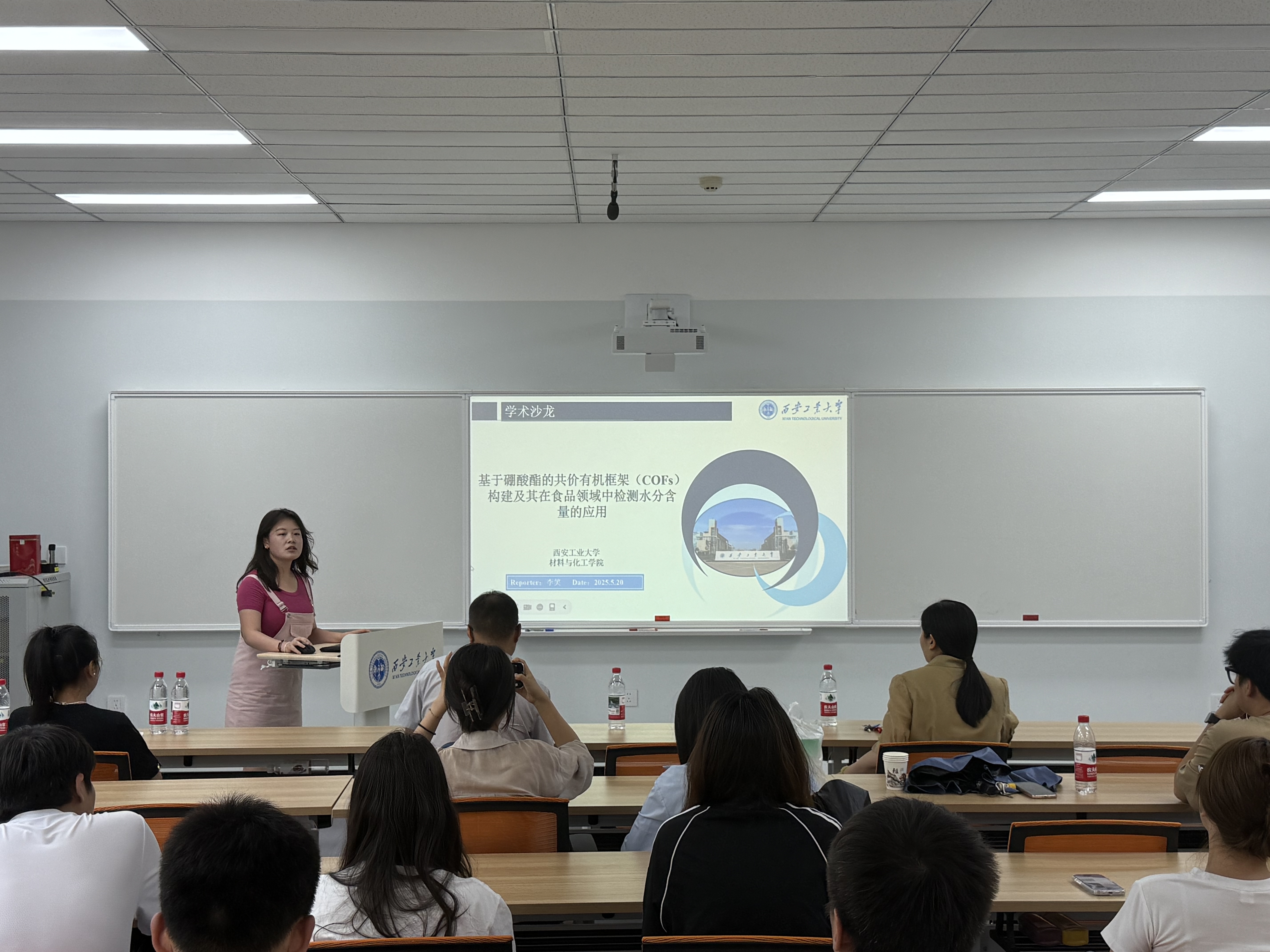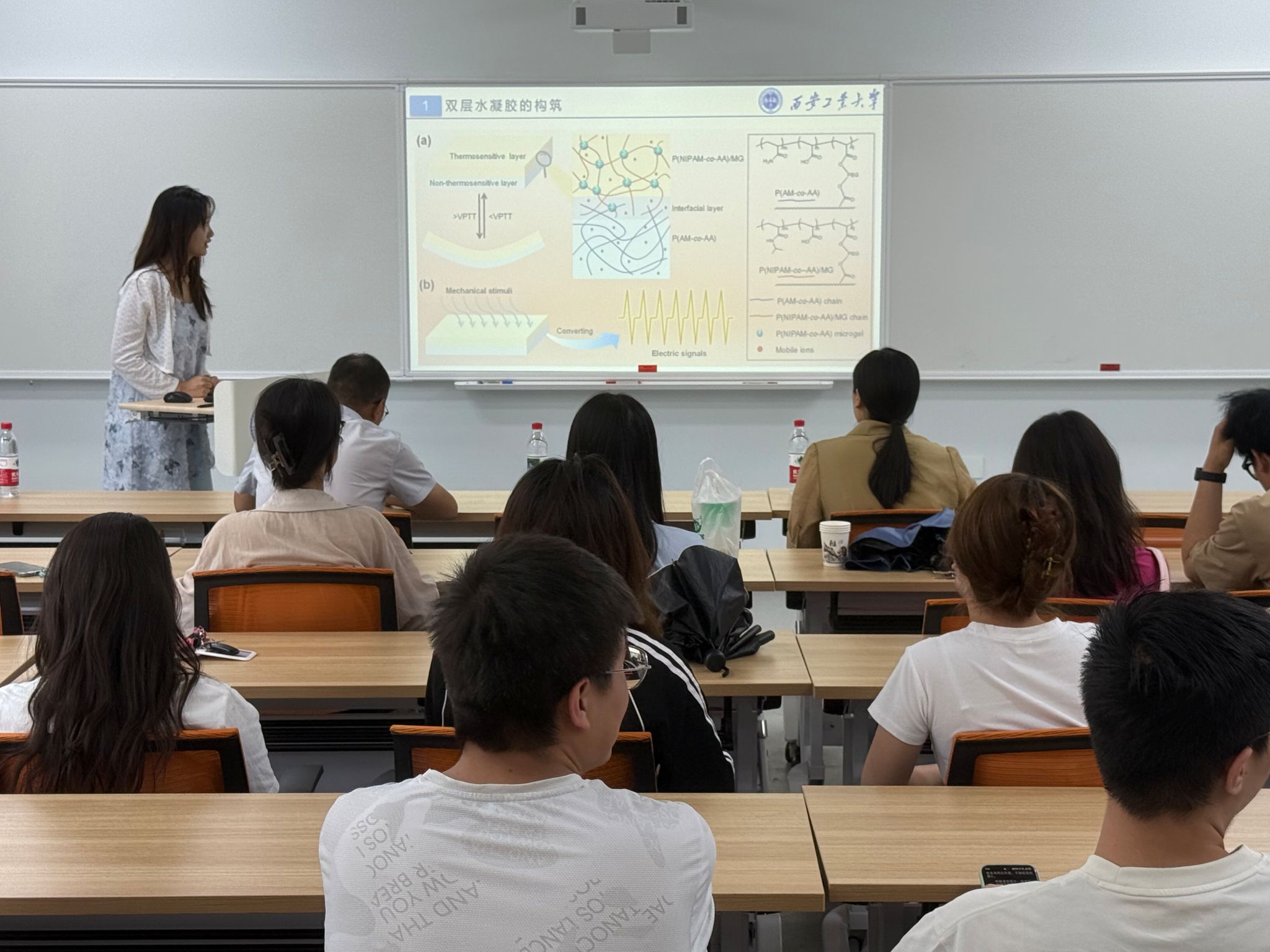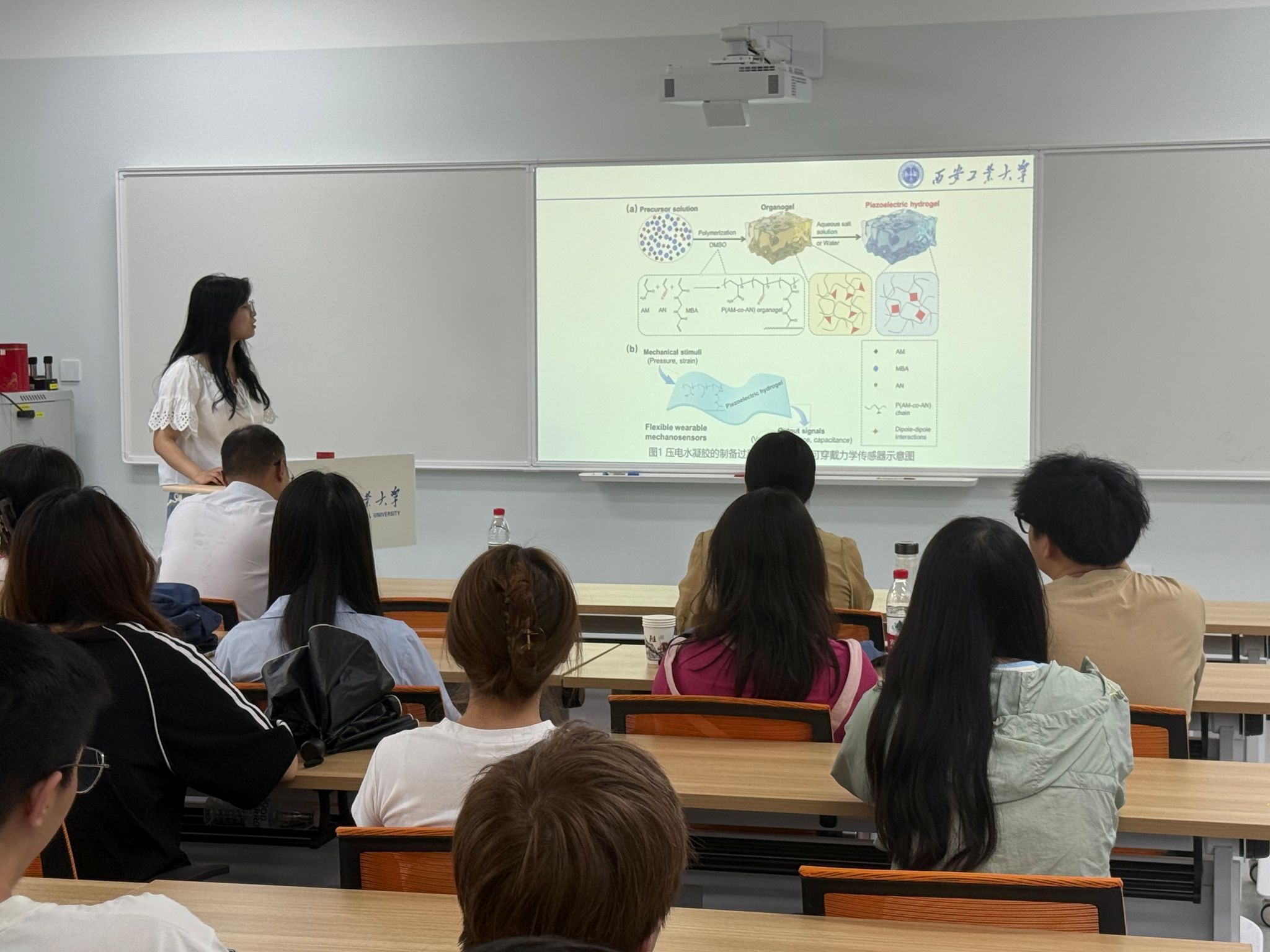 在学术分享环节,王珂萱同学以“利用偶极-偶极相互作用机械增强的压电水凝胶用于柔性可穿戴机械力传感器”为题,介绍了其在高性能柔性传感器件方面的研究;吴萍同学探讨了“基于热敏性增强的双层不对称水凝胶用于柔性器件研究”,展示了水凝胶在传感与驱动一体化方面的创新设计;马雪浩同学则聚焦“基于智能手机辅助的近红外荧光传感器对酒类中水分的视觉检测”,提出了一种便捷的水分定量检测新方法;李笑同学围绕“构建具有高比表面积的硼酸酯基共价有机框架用于食品领域中水分含量的检测”,介绍了新型共价有机框架材料在食品安全检测中的应用潜力。
