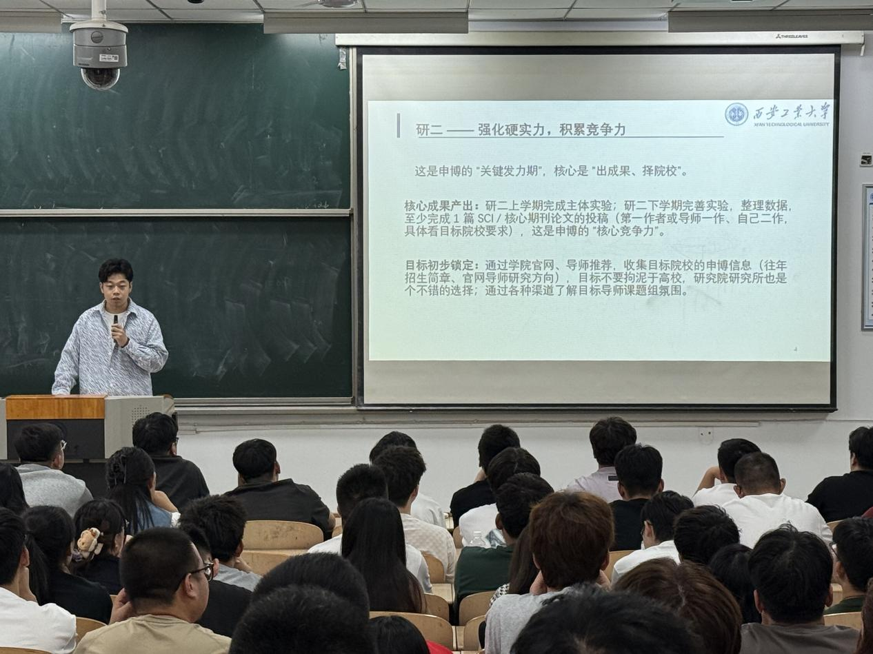 活动紧扣“职业规划前置”核心,先通过专题讲解梳理硕士阶段 “学术深造-行业就业-综合发展”三大路径,结合学院学科特色,拆解不同方向的能力储备重点,帮助新生建立“目标倒推”思维;随后特邀成功升博的学长分享经验,从“博士申请时间线规划”“科研论文写作技巧”“导师沟通与学术资源获取”等实用维度展开。在现场互动问答环节,针对性解答新生“科研入门难点”“读博适配性判断”等疑问。现场新生纷纷表示,通过提前了解生涯规划框架、吸取学长实战经验,不仅缓解了新生入学的迷茫,更明确了入学初期的重点努力方向。